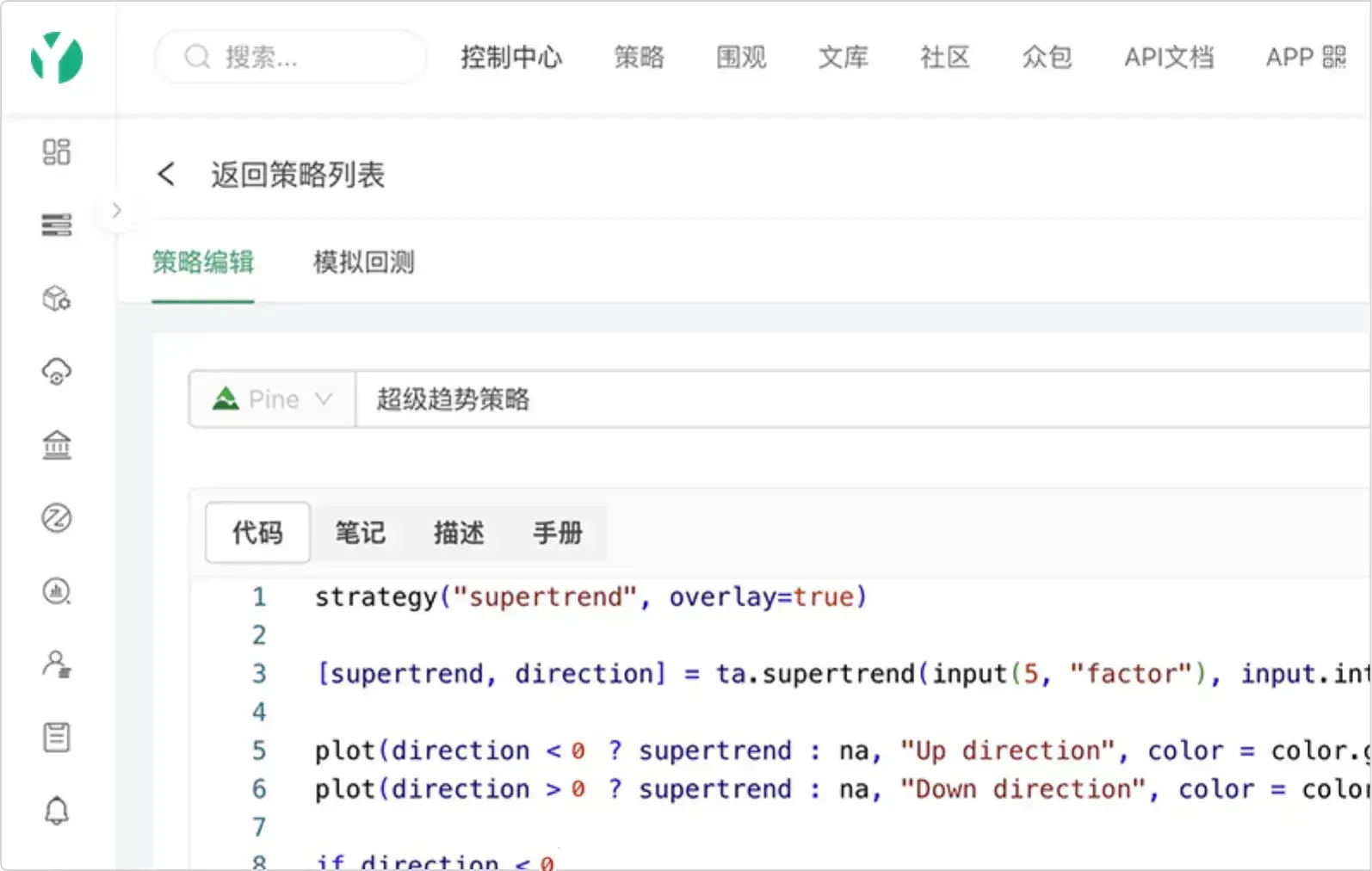 平台支持使用JavaScript、Python、C++、PINE等完整的高级语言,也支持可视化语言、My语言(兼容文华财经)、工作流 实现策略。