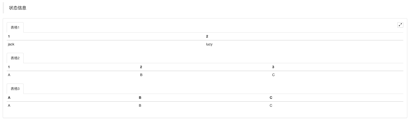var table2 = {type: 'table', title: 'table2', cols: ['列1', '列2'], rows: [ ['abc', 'def'], ['ABC', 'support color #ff0000']]}